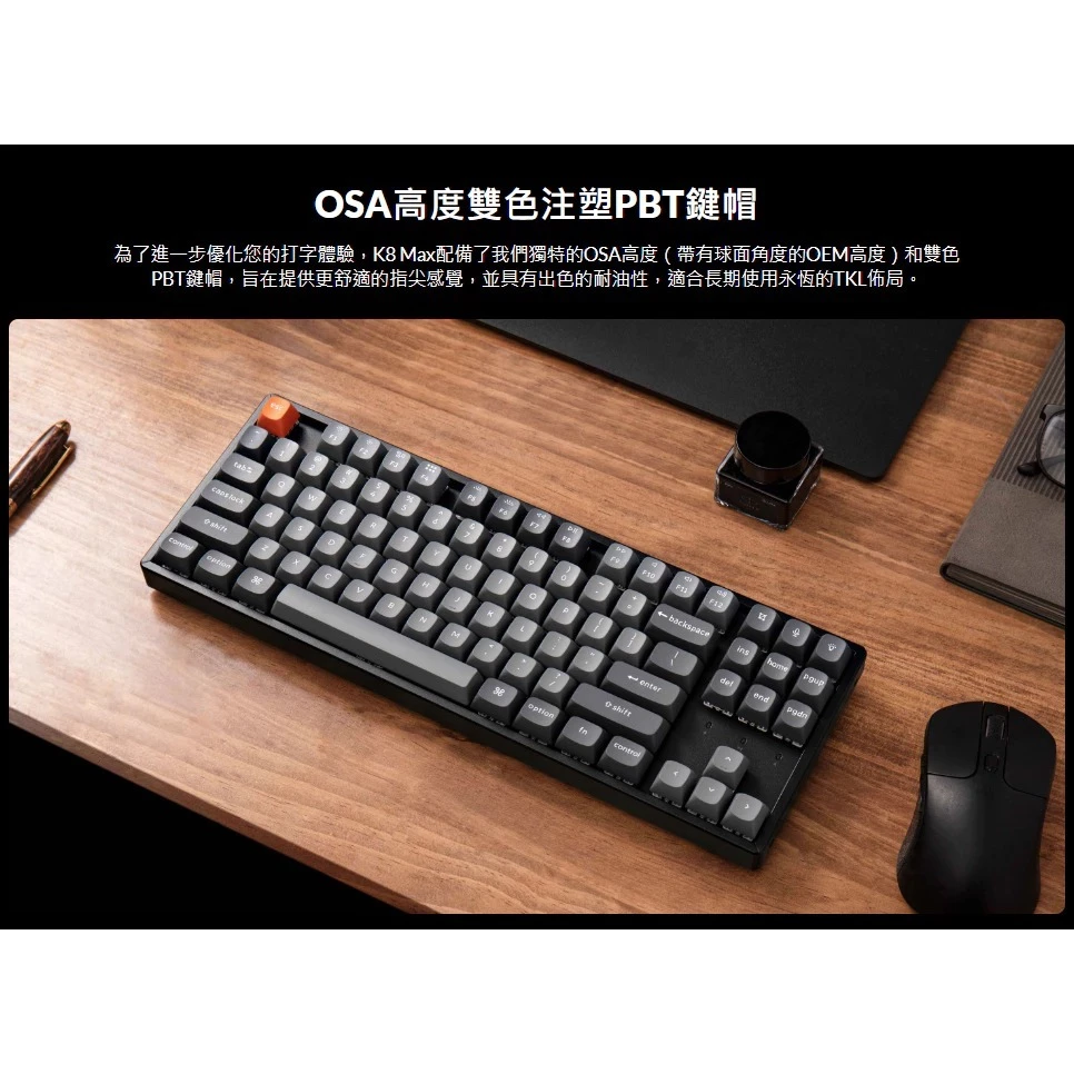 K8 Max是一款採用TKL(80%)佈局的無線機械式鍵盤。它支援2.4GHz、藍牙和有線連接。它可透過QMK和Keychron Launcher網路應用程式進行配置,為您的工作和遊戲提供無限的可能性並提高生產力!