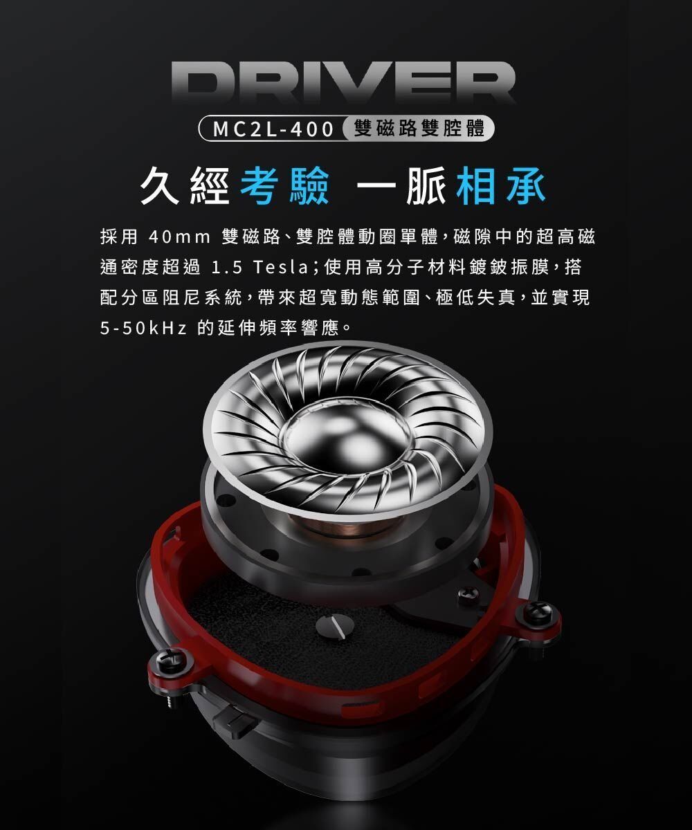 採用 40mm 雙磁路、雙腔體動圈單體,磁隙中的超高磁通密度超過 1.5 Tesla;