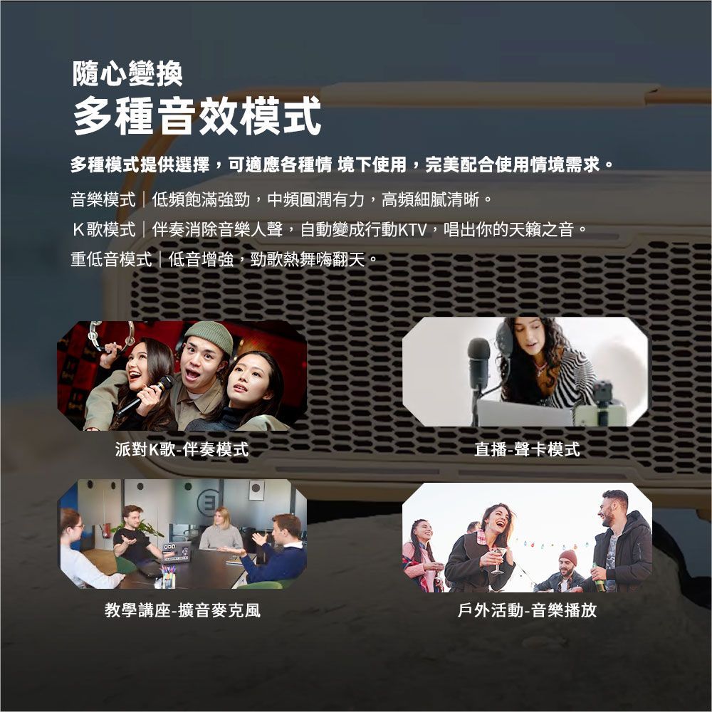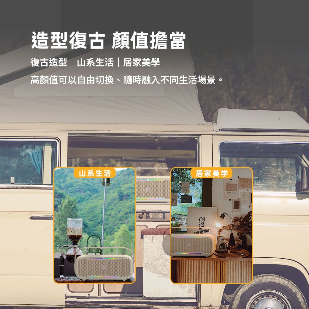 時尚復古造型、100W大功率輸出、6600mAh超長續航力、隨心變換多種音效模式、隨音舞動RGB燈光效果、適應多種使用場景。
