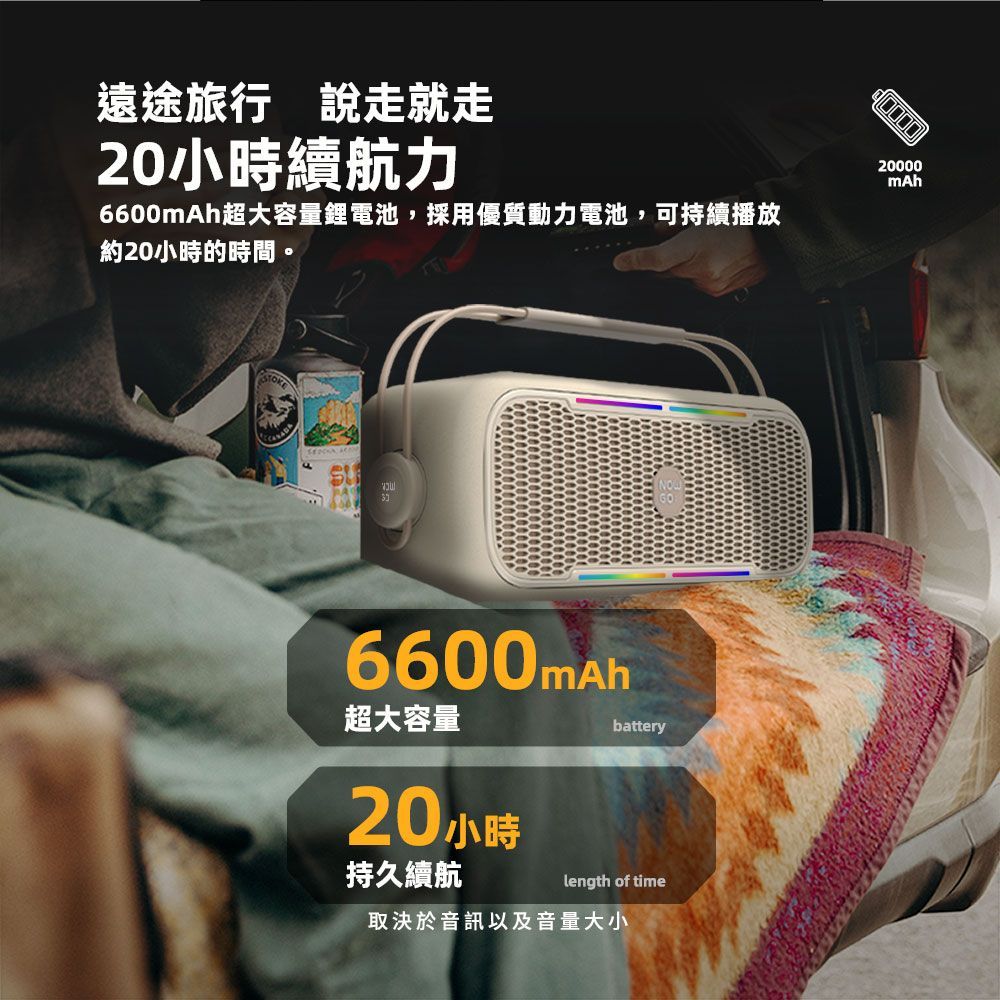 戶外遠途旅行,帶著NOWGO C1說走就走,可持續播放約20小時的時間,電力一路隨行不斷,唱享天籟之聲。※些微誤差值,取決於音訊及音量大小