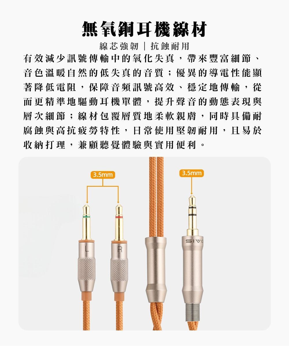 線芯強韌、抗蝕耐用,有效減少訊號傳輸中的氧化失真,且帶來細節豐富、音色溫暖自然的低失真的音質。