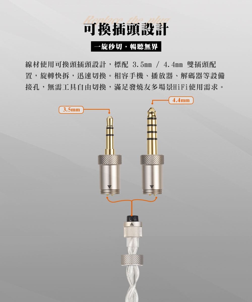 線材使用可換頭插頭設計,標配3.5mm/4.4mm雙插頭配置,旋轉快拆,迅速切換。相容手機、播放器、解碼器等設備接孔,無需工具自由切換,滿足發燒友多場景HiFi使用需求。