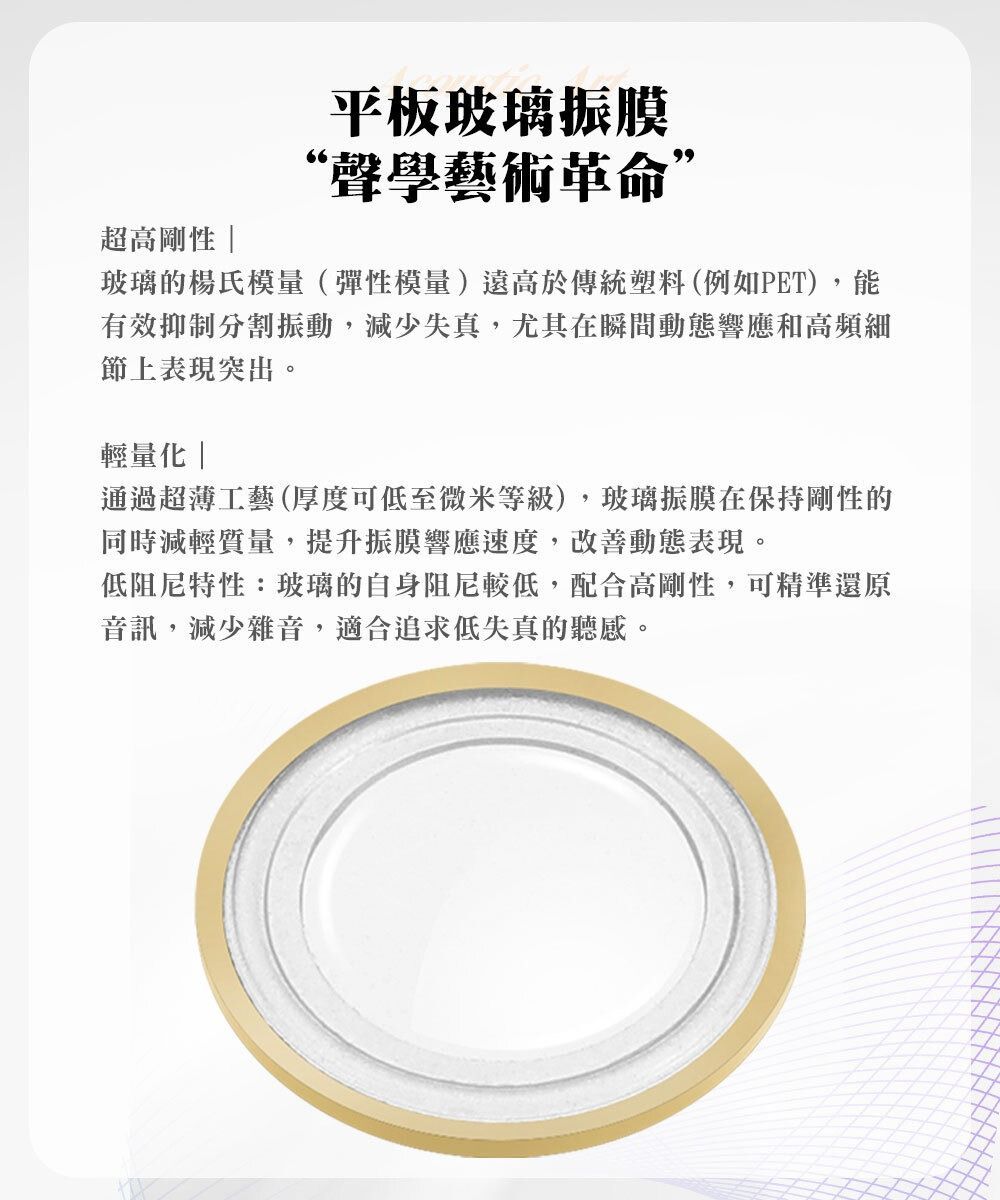 品牌首款將平板玻璃振膜與動圈式單體的結構融合,突破傳統材質 的限制,設計出輕量化與超剛性的平衡,振膜瞬間啟用/暫停能力極強,精準還原複雜音訊,為動態分毫畢現。