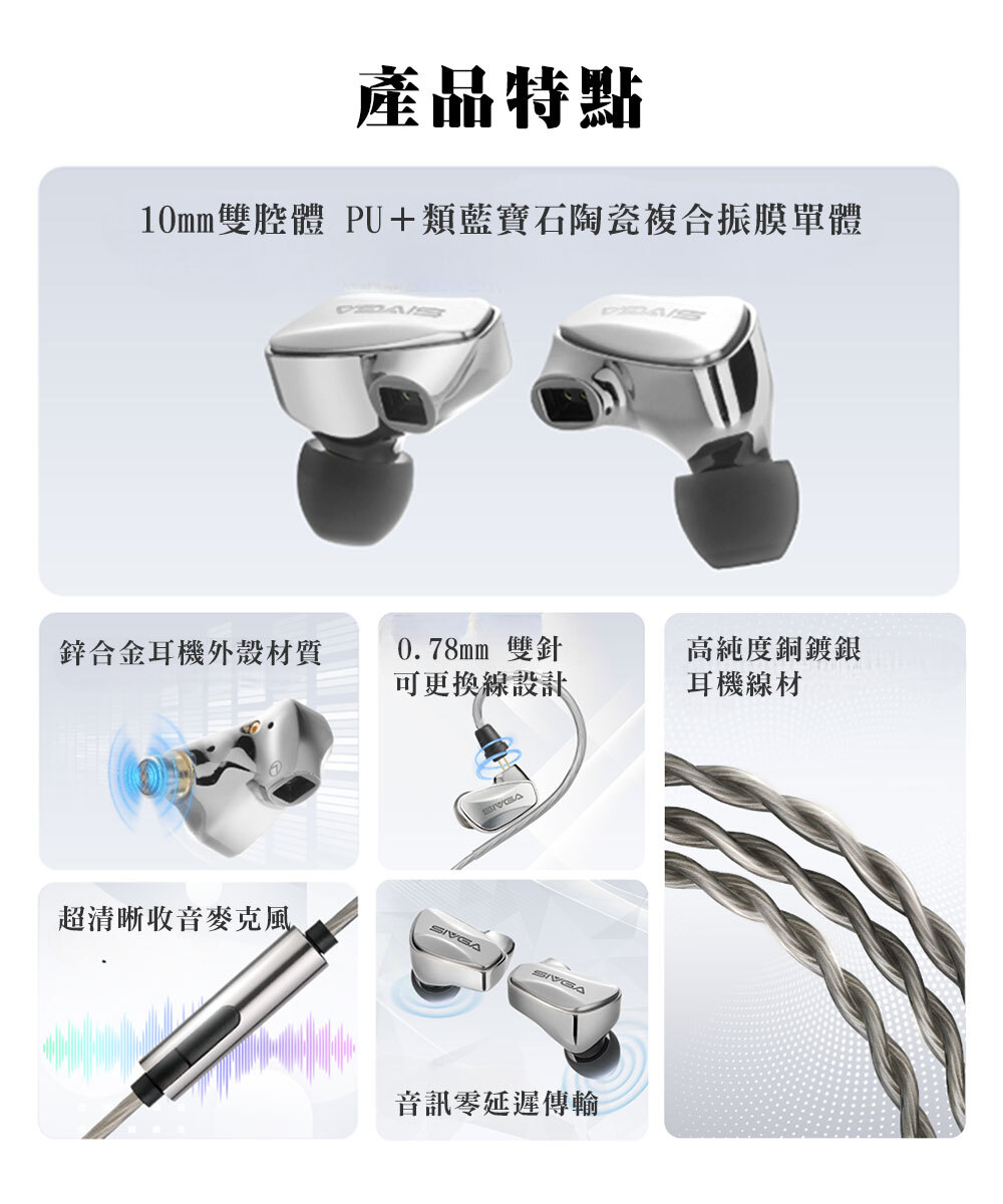 10 mm 單體採用 PU 與類藍寶石陶瓷材質,能迅速且精準回應音訊訊號的變化,透過剛性與阻尼的平衡配置,有效抑制分裂振動,讓聲音更穩定純淨。