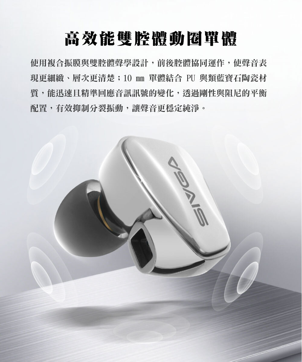 使用複合振膜與雙腔體聲學設計,前後腔體協同運作,使聲音表現更細緻、層次更清楚。