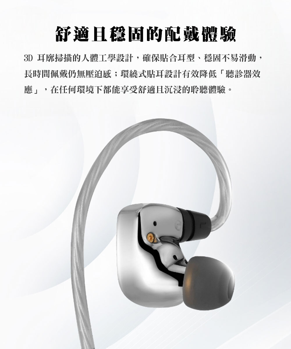 3D 耳廓掃描的人體工學設計,確保貼合耳型、穩固不易滑動,長時間佩戴仍無壓迫感。