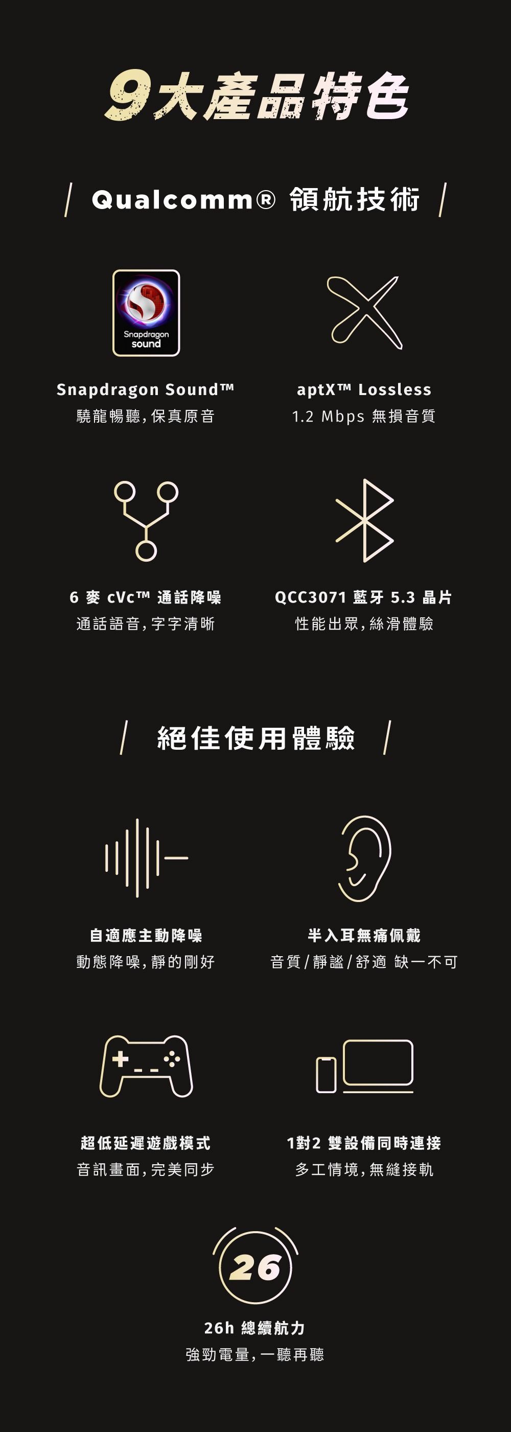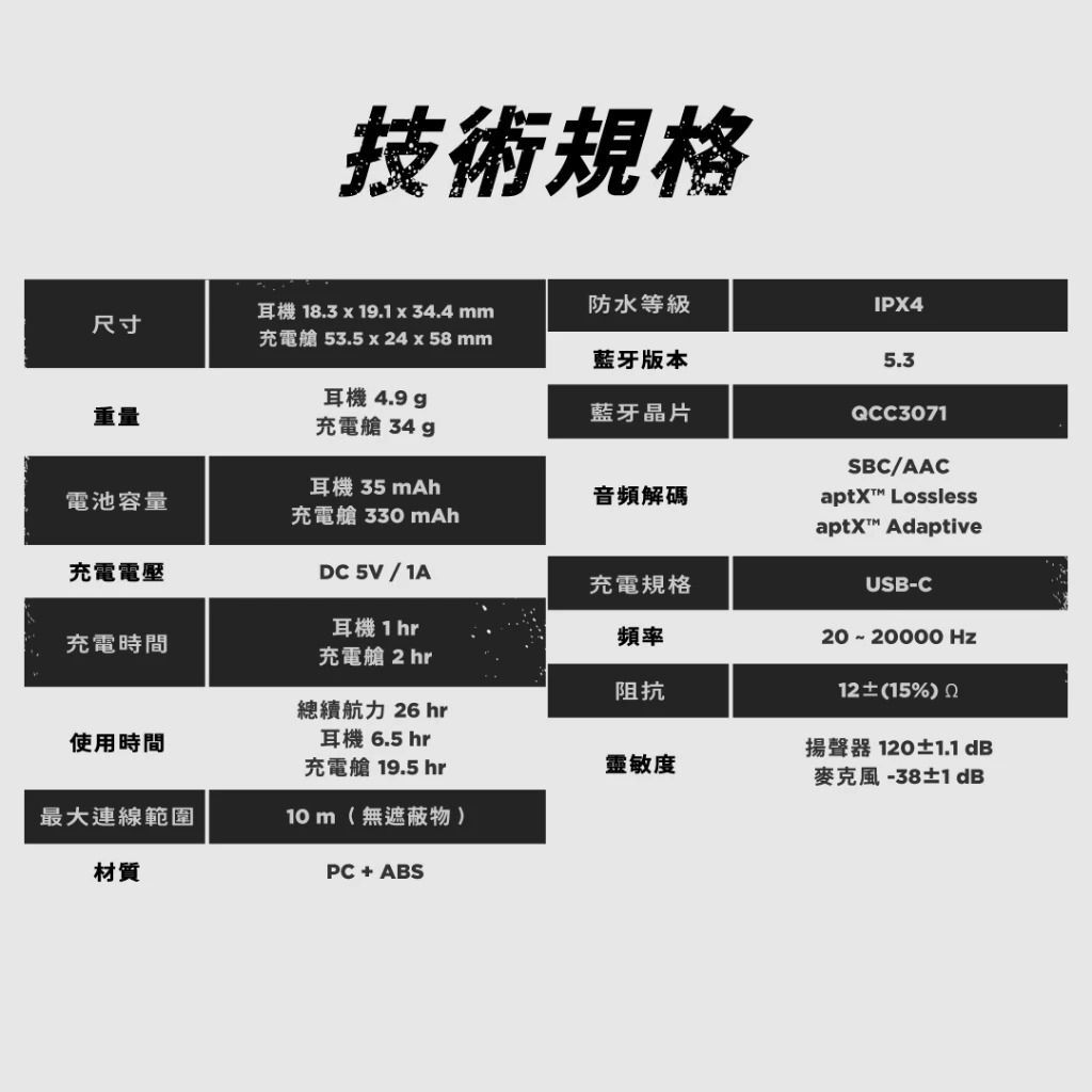 使用時間:耳機 6.5hr / 充電艙 19.5hr / 總續航 26hr