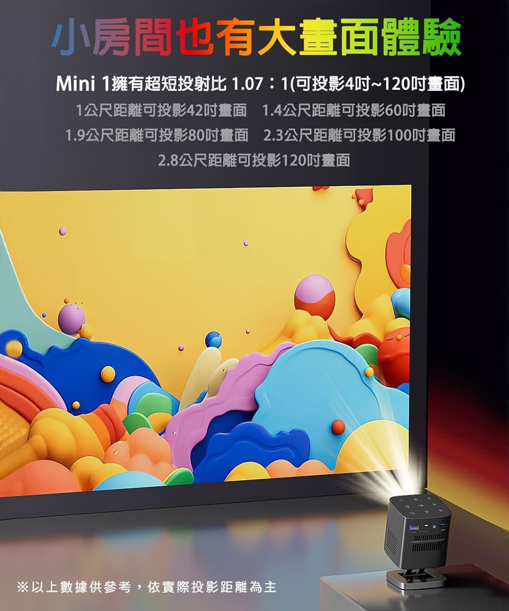 距離1.9公尺可投影80吋畫面