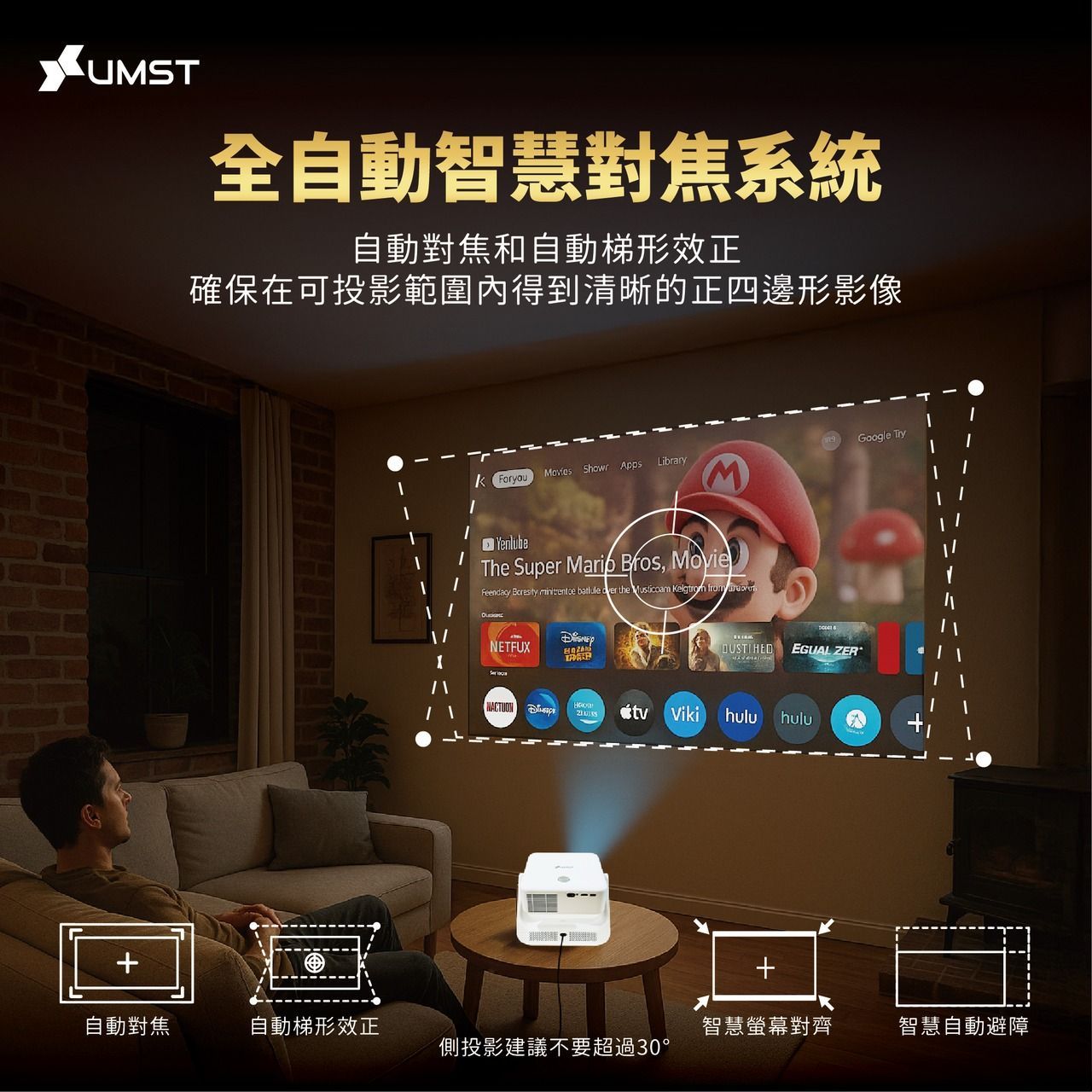 ●全自動對焦/全向梯形校正+智慧自動避障/入幕